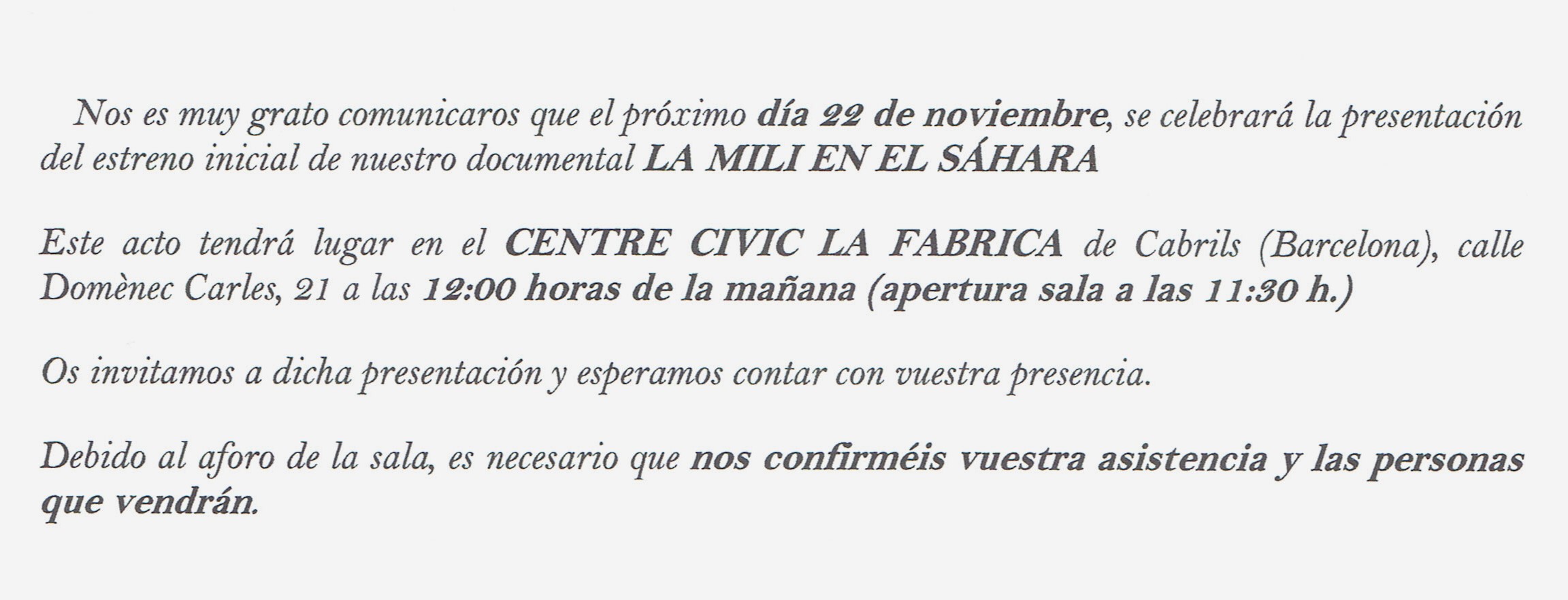 Nos es muy grato comunicaros que el próximo día 22 de noviembre, se celebrará la presentación del estreno inicial de nuestro documental LA MILI EN EL SÁHARA